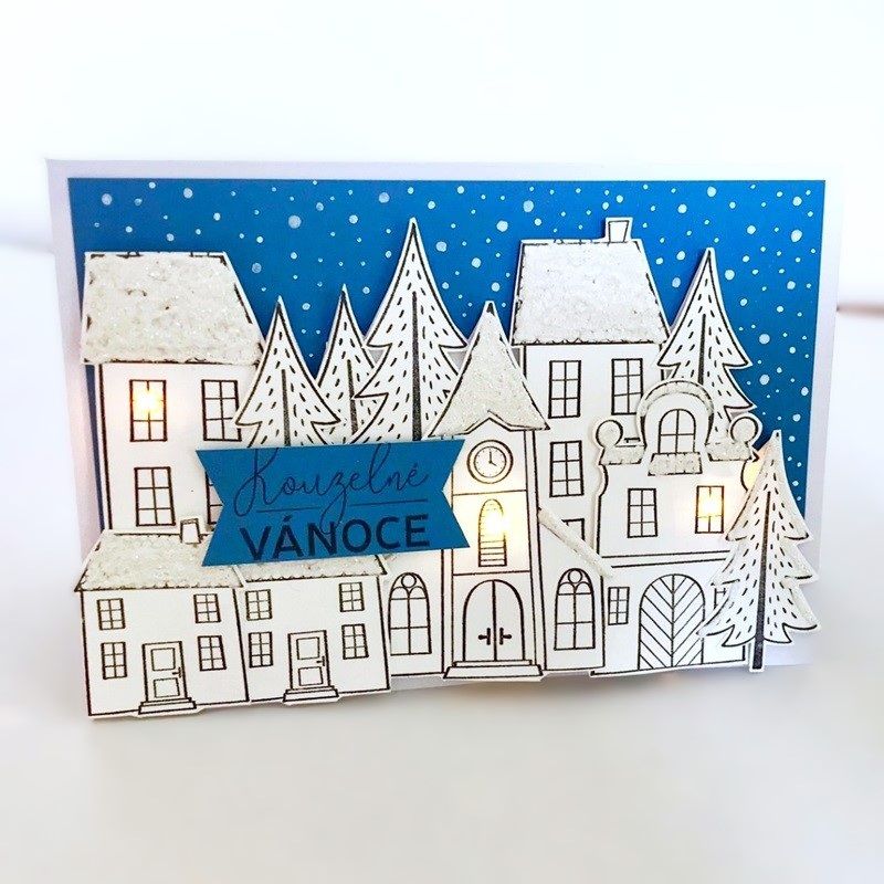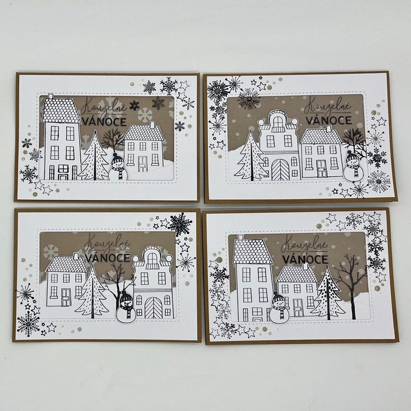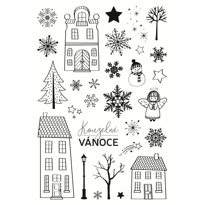 Naše autorská sada razítek z řady Stampo Art s motivy zimních domečků, vloček, hvězdiček, roztomilé andělky a českého nápisu. Ideální k natištění černým inkoustem a vybarvení podle vlastní chuti, ať už na papíře, textilu nebo v modelovacích hmotách.