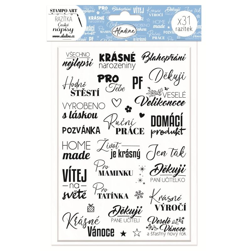 Naše autorská sada razítek z řady Stampo Art s motivy českých nápisů na přání, visačky, jmenovky, dárečky a další projekty. Ideální na narozeniny, svátky, Vánoce, Den matek či otců, jako poděkování kantorům i k označení vlastnoručních výrobků. Hodí se na papír, textil nebo modelovacích hmot.