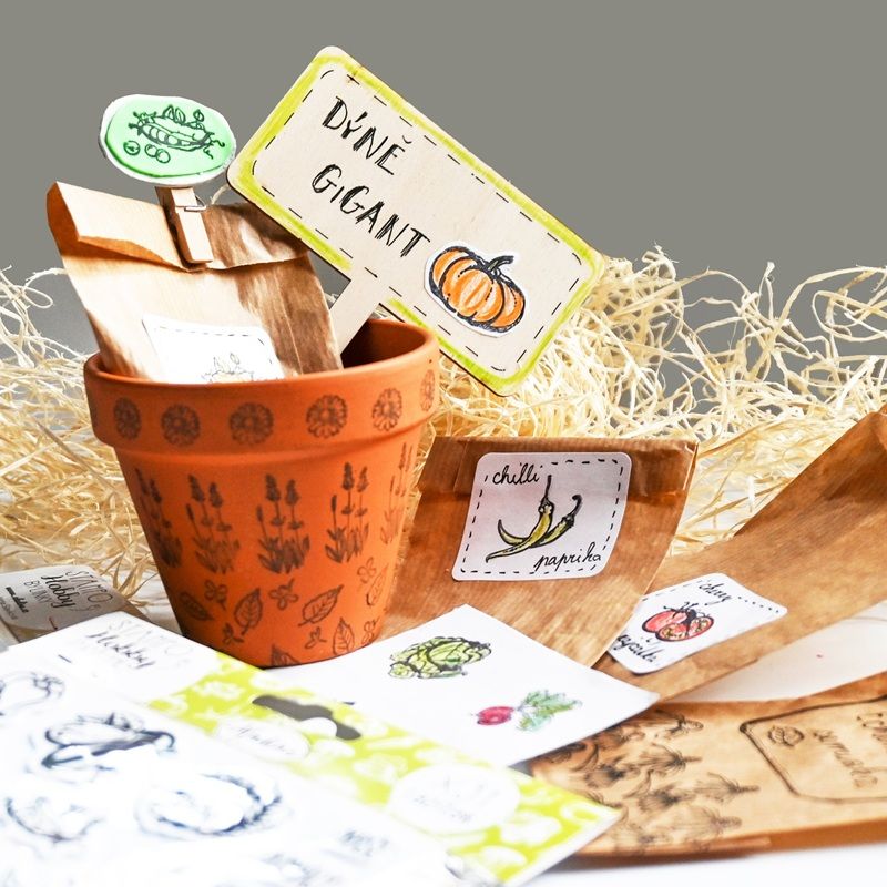 Sada obsahuje 31 razítek s obrázky zeleniny a českými nápisy k popisování nakládané zeleniny, sušených dobrot i gastronomických specialit.