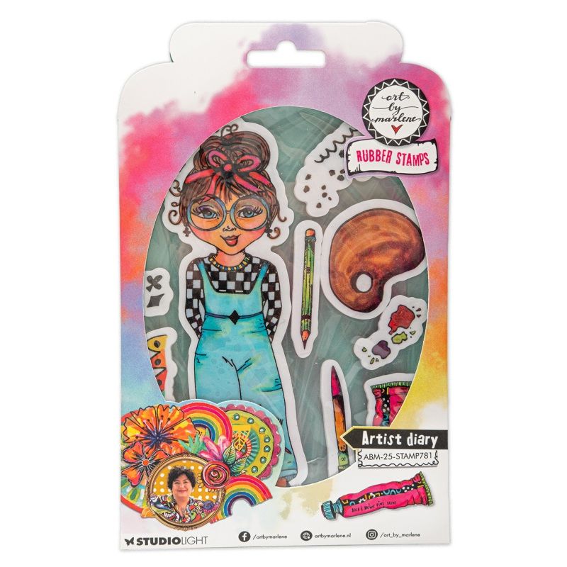 Gumová razítka na cling pěně s motivem postavy výtvarnice a jejích nástrojů navrhla svérázná umělkyně Art by Marlene. Používají se s akrylovým blokem .