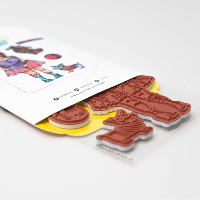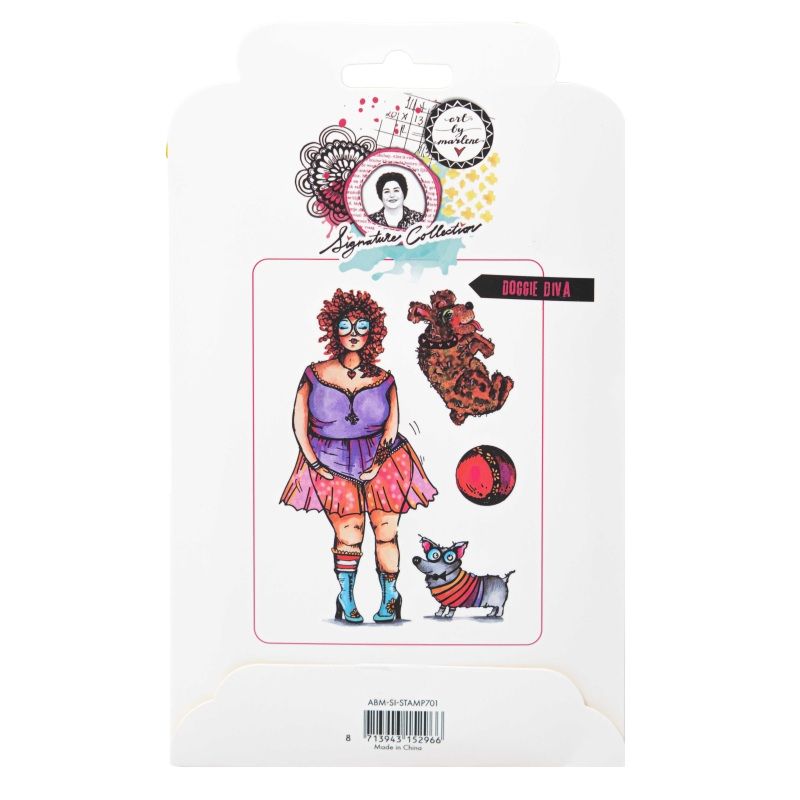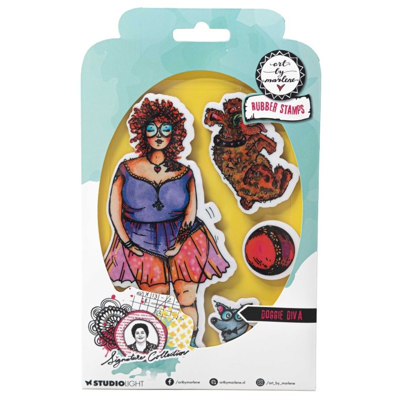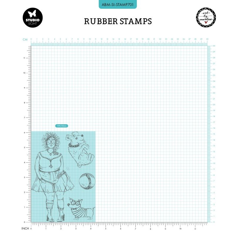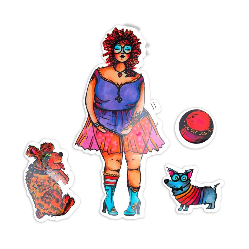 Gumová razítka na cling pěně s motivem paničky a jejích chlupatých kamarádů navrhla svérázná umělkyně Art by Marlene. Používají se s akrylovým blokem .