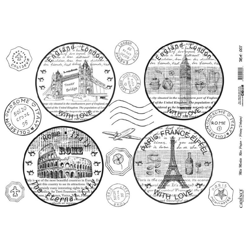 Rýžový papír je ideální na decoupage – ubrouskovou techniku. Černobílá koláž s cestovatelskými motivy vynikne na výrobcích z papíru, dřeva, textilu apod. Formát A3 nebo A4.