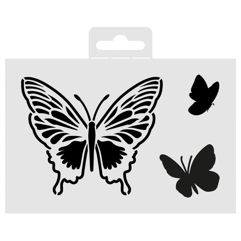Šablona s motýlím motivem je vhodná pro práci s papírem, textilem, dřevem a mnoha dalšími materiály. Motýlky v siluetě můžete zkusit nanést světlou barvou a pak jim přikreslit detaily křídel dle vlastní fantazie. Rozměr šablonky je 10 x 15 cm, díky velikosti se obzvlášť hodí na drobnější papírové projekty, třeba výrobu přání (cardmaking).