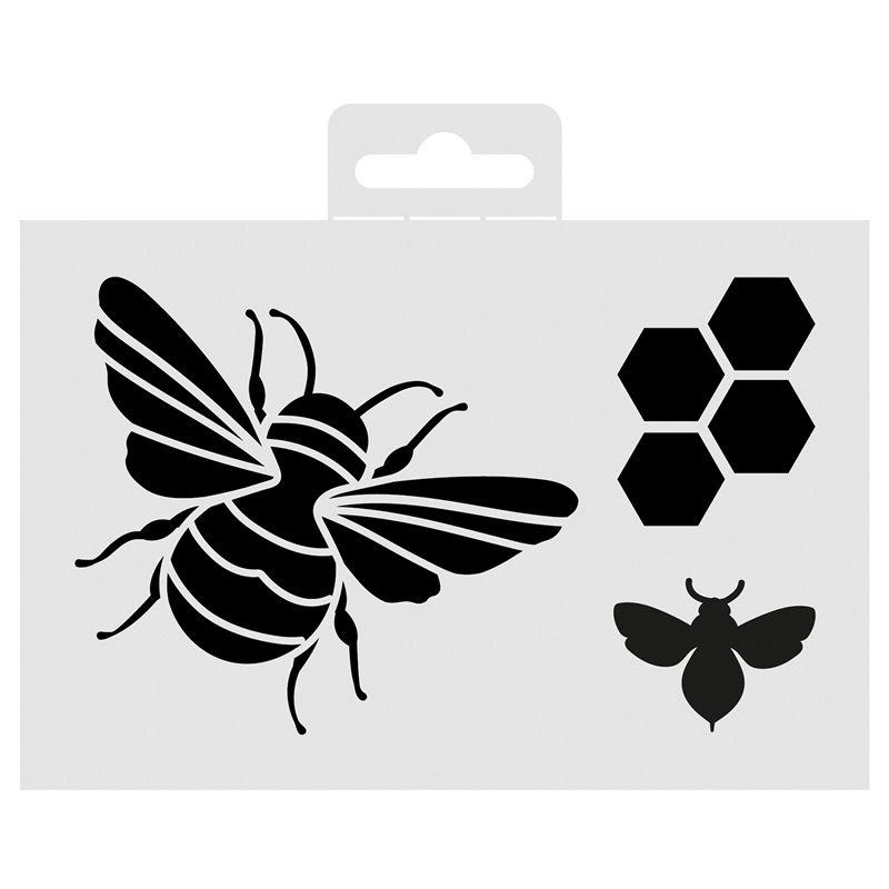Šablona s motivem včel a pláství je vhodná pro práci s papírem, textilem, dřevem a mnoha dalšími materiály. Plástev můžete nanést na pozadí a přes ni jinou barvou navrstvit jednu ze včelek pro prostorovější efekt. Rozměr šablonky je 10 x 15 cm, díky velikosti se obzvlášť hodí na drobnější papírové projekty, třeba výrobu přání (cardmaking).