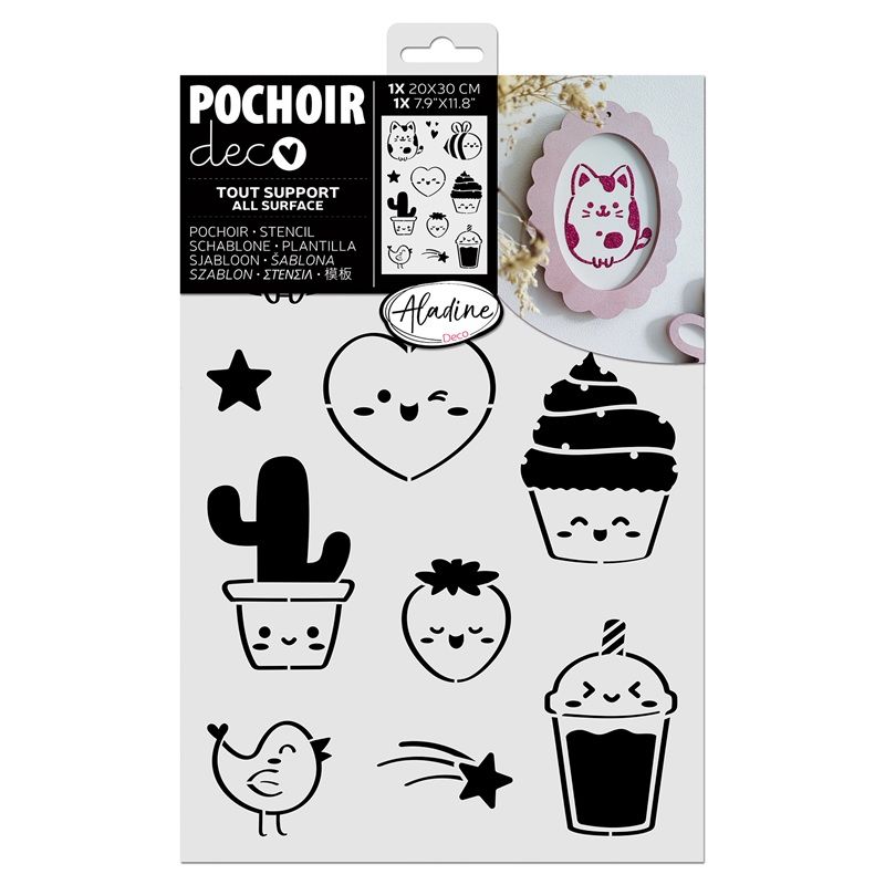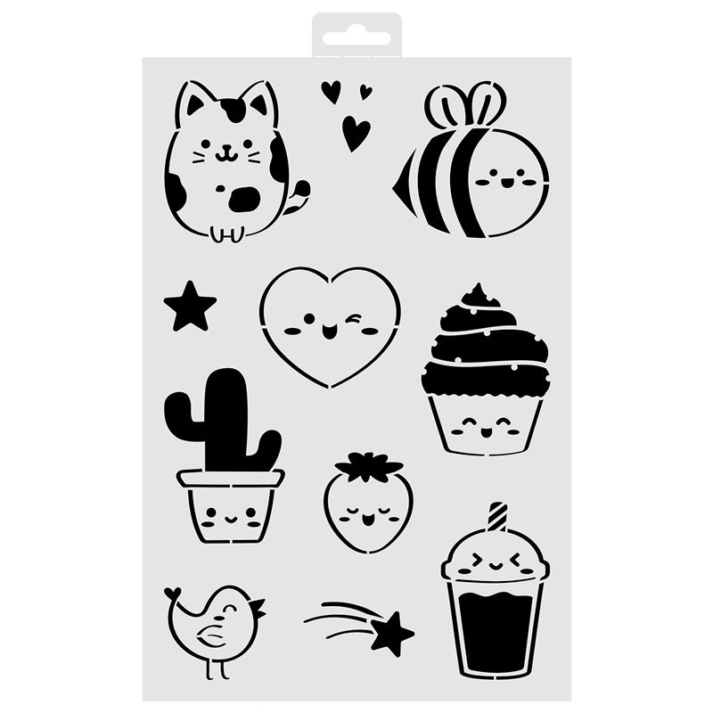 Šablona s motivy dobrot a zvířátek v japonském kawaii stylu je vhodná pro práci s papírem, textilem, dřevem a mnoha dalšími materiály. Rozměr šablonky je 20 x 30 cm, motivy jsou velikostí vhodné na menší projekty, třeba na přední stranu přání.