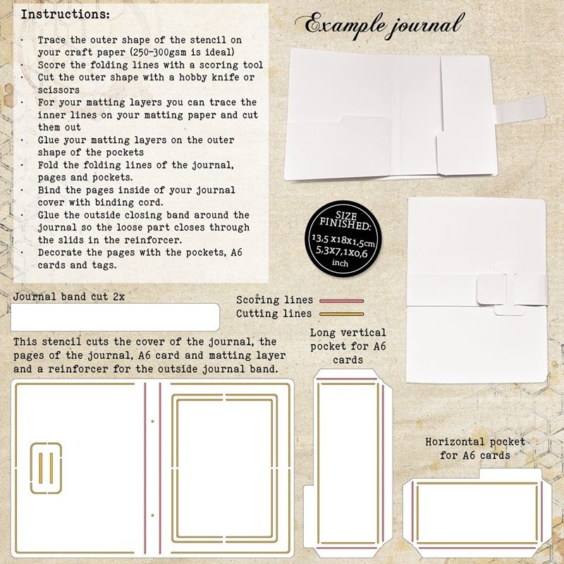 S touto šablonou si jednoduše poskládáte originální art journal, album či sešit s kapsami a papírovým páskem na uzavření. Je vyrobena z plastu a stačí podle ní obkreslit a narýhovat arch papíru, vystřihnout a slepit. Základ sešitu lze pak dozdobit podle vlastní chuti. Šablona je pevná a odolná, dá se používat opakovaně. Její rozměr je 25,8 x 35,8 cm. Rozměr poskládaného výrobku je 13,5 x 18 x 1,5 cm.
