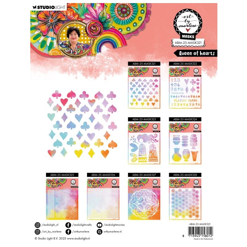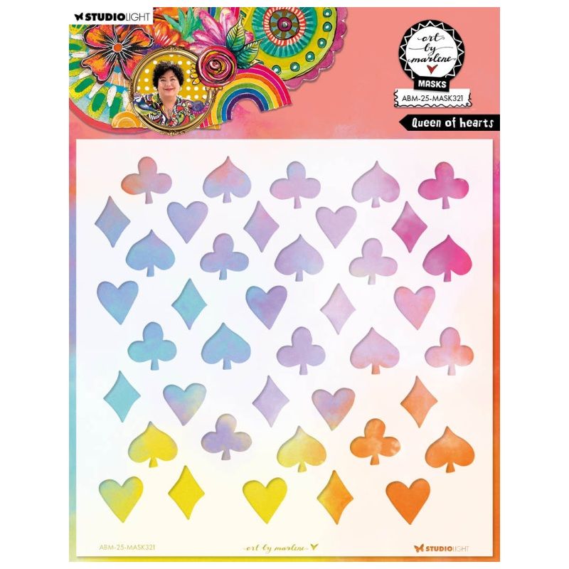 Šablona se vzorem karetních barev je vhodná pro práci s textilem, papírem, dřevem, betonem a mnoha dalšími materiály. Šablona má rozměr 20,3 x 20,3 cm (v palcích 8” x 8”) a je skvělá na všechny hravé projekty. Skvěle se hodí na práci s DIY hracími kartami k dotvoření z naší oblíbené Art by Marlene kolekce.