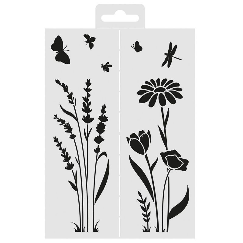 Plastové šablony s květinovými motivy lze používat opakovaně se spreji, barvami, inkousty i pastami na papír, dřevo, textil a další povrchy. Celkový rozměr 18 x 13 cm. Celý popis