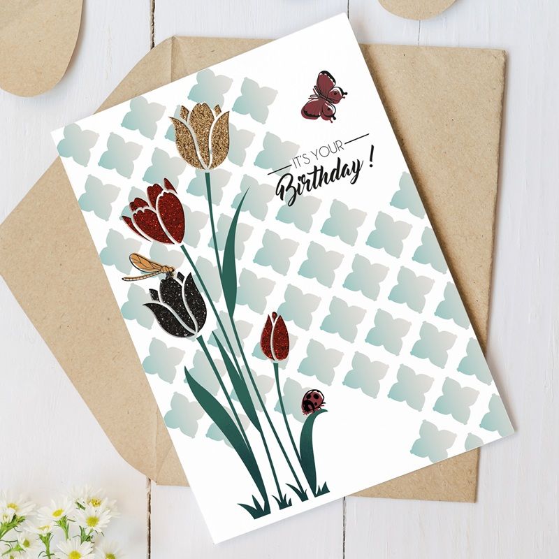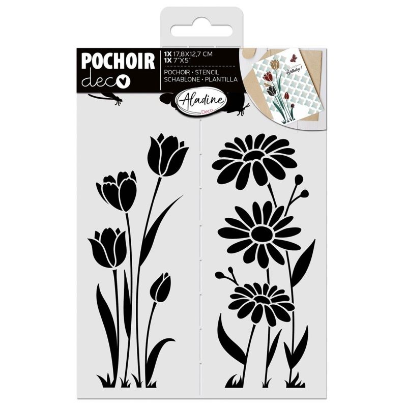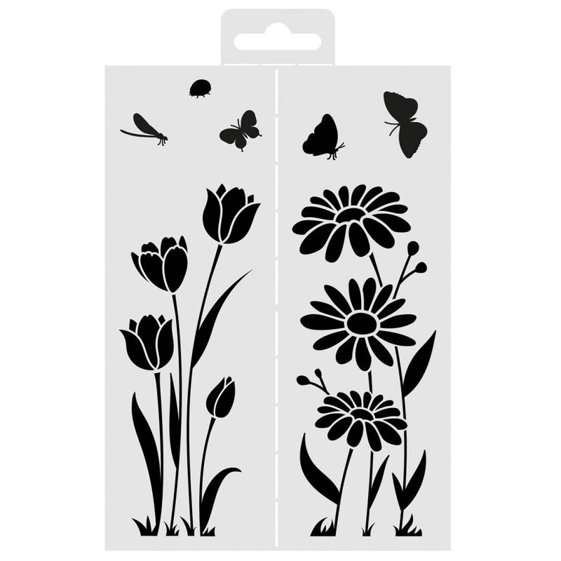 Dvojitá šablona s motivy květin je vhodná pro práci s papírem, textilem, dřevem a mnoha dalšími materiály. Šablonky jsou spojené jen v několika bodech, které lze jednoduše přestřihnout a mít tak 2 samostatné šablony pro snazší práci. Rozměr jedné samostatné šablony je 18 x 6,5 cm, díky velikosti se skvěle hodí pro papírové projekty orientované na výšku.