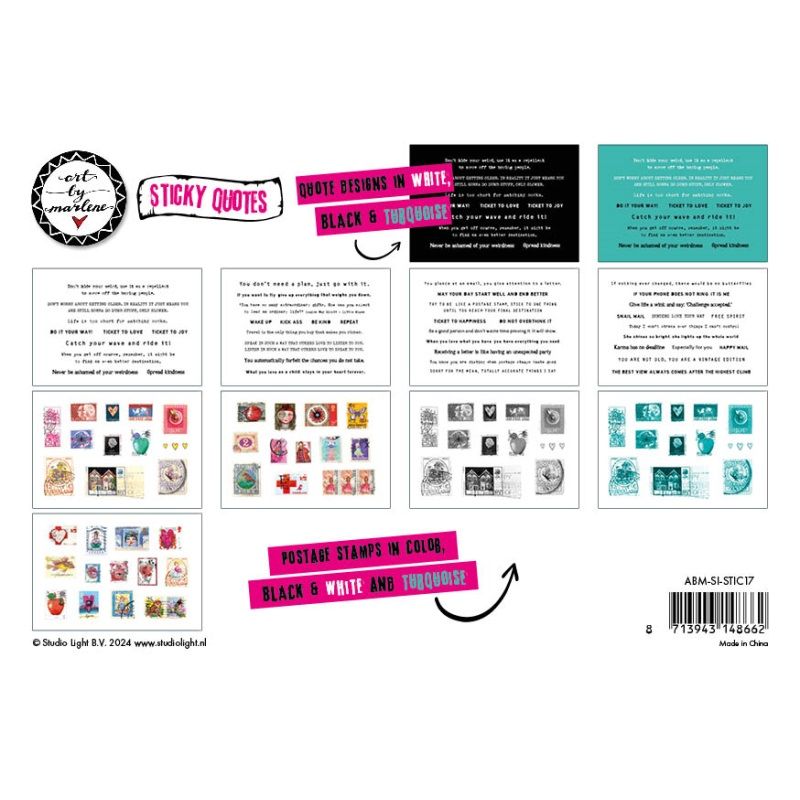 Úžasná kniha se samolepkami textů a obrázků od umělkyně Marlene Meier-van Niekerk. Kniha je plná inspirativních, vtipných a svérázných citátů v anglickém jazyce. Blok obsahuje celkem 21 archů samolepek. Textové samolepky jsou buď na bílém, černém nebo tyrkysovém podkladu. Blok dále obsahuje ilustrované poštovní známky – barevné, černobílé a v odstínech tyrkysu. Veškeré nálepky skvěle využijete na mnohých kreativních projektech.