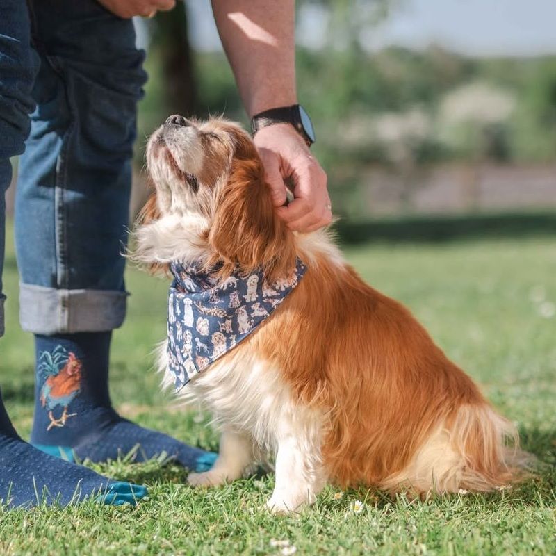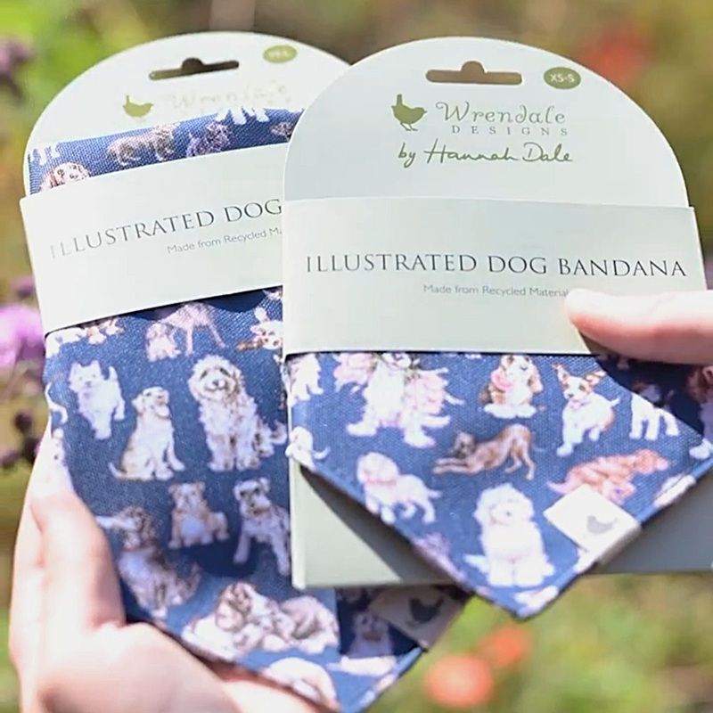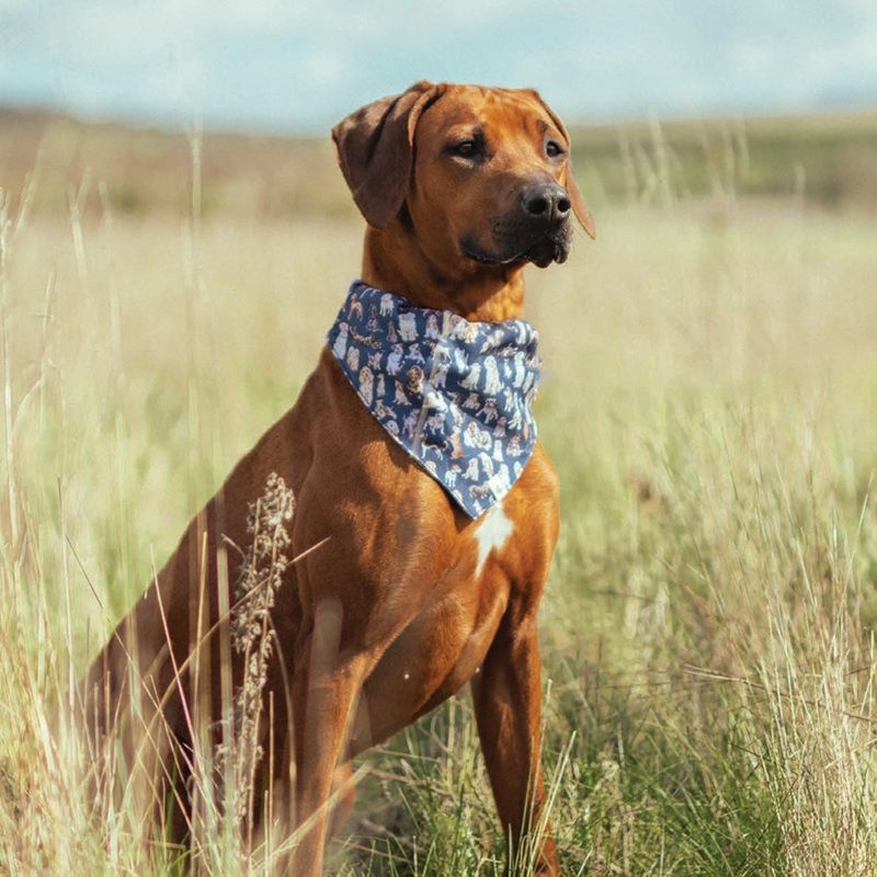 Psí šátek bude vašemu nejlepšímu příteli slušet na focení, speciální příležitosti i na každodenní nošení! Ve velikosti M/L se hodí pro střední a větší plemena, stačí ho navléct na obojek – šíře tunelu šátku je 5 cm. Ozdoben je oboustranně akvarelovými ilustracemi nejrůznějších druhů psů na námořnicky modrém pozadí. Vyroben je z recyklovaných materiálů a lze ho prát v pračce na 30 °C.