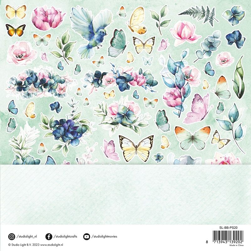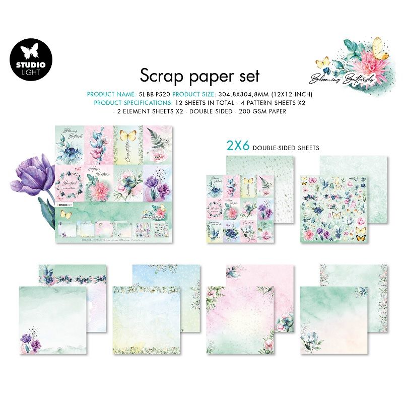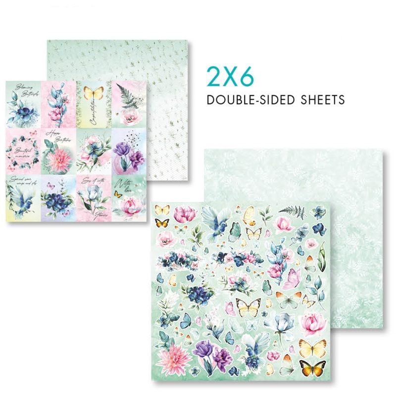 Sada velkých scrapbookových papírů s ilustracemi květinek a motýlů na pastelově akvarelových pozadích pochází z rozkvetlé jarní kolekce Blooming Butterfly a bude skvělým základem na nejrůznější papírové tvoření.