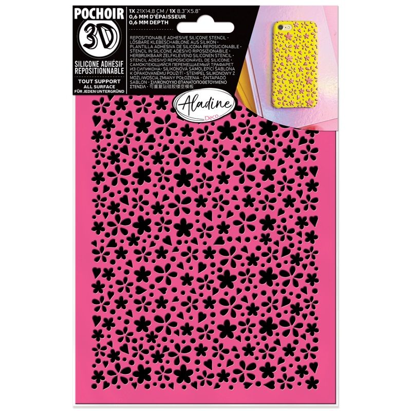 Silikonová samolepící šablona Aladine k opakovanému použití je jedinečná ohebná šablona, která umožňuje zdobit i oblé předměty. Formát A5 (21 x 14,8 cm), tloušťka 0,6 mm. Vzor kytičky.