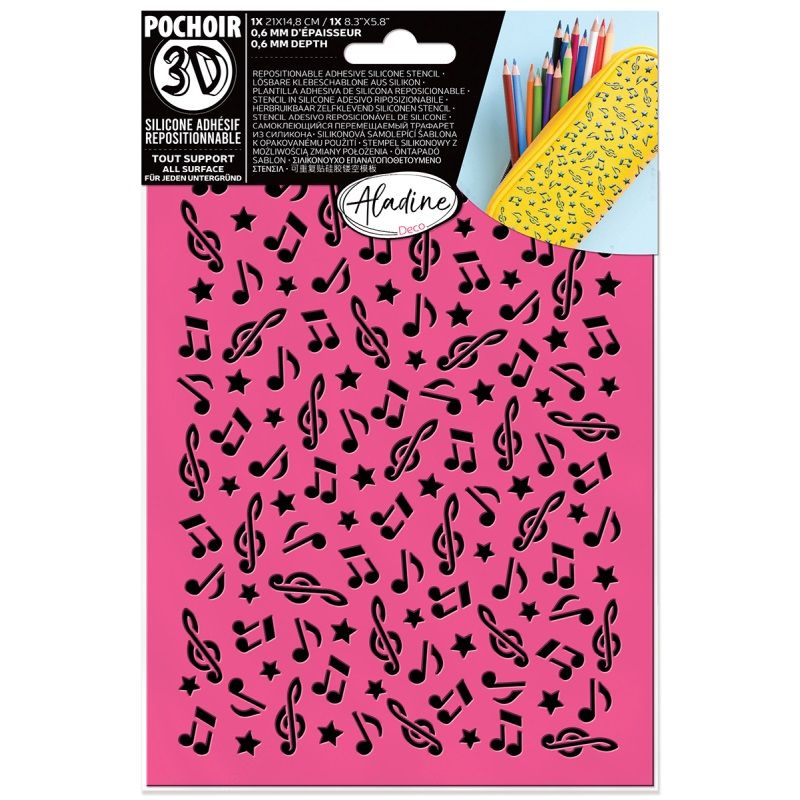 Silikonová samolepící šablona Aladine k opakovanému použití je jedinečná ohebná šablona, která umožňuje zdobit i oblé předměty. Formát A5 (21 x 14,8 cm), tloušťka 0,6 mm. Vzor noty.