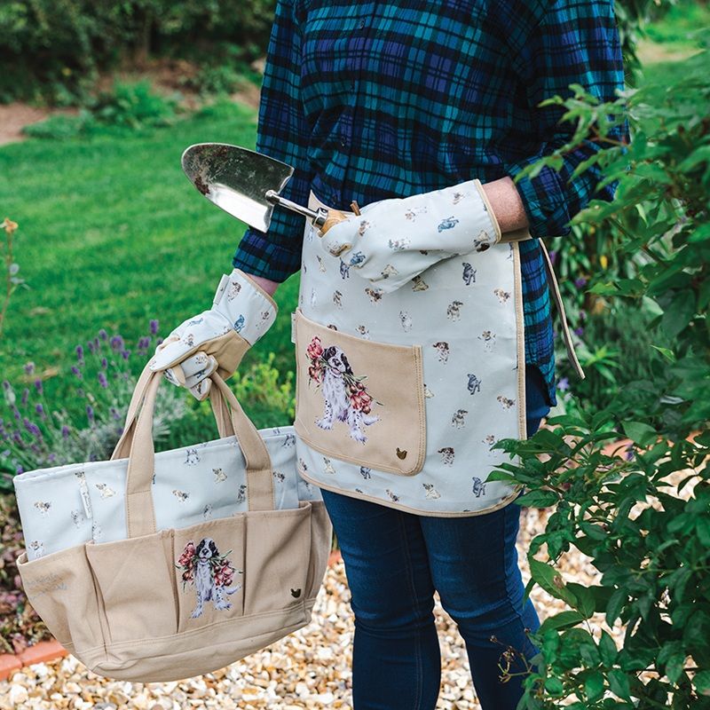 Taška je neobyčejná svým originálním designem – po celé ploše potištěna obrázky pejsků, vnější kapse vévodí veselý motiv kokršpaněla. V rohu kapsy je na ozdobu mosazný cvoček ve tvaru ptáčka – loga anglické značky Wrendale Designs. Uvnitř je taška proužkovaná, lemování je ve stylově kontrastní barvě. Tašku lze prát v pračce.