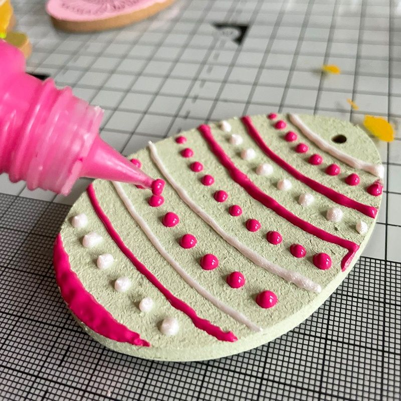 Vymačkněte tolik barvy, jak chcete mít perličku velkou. Doporučujeme aplikovat mírně od sebe, aby se perličky neslily dohromady. Tekuté perly jsou obzvlášť vhodné k malování na kamínky , dekorování mandal či velikonočních vajíček. Barvu můžete použít i na předměty malované akrylovou barvou a dodat jim tak efektní 3D vzhled.