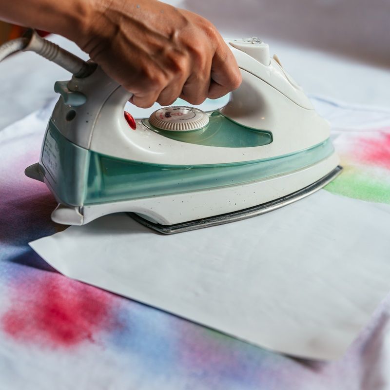 2. Nastavte žehličku na 180° C bez napařování. Důkladně zažehlete přes pečicí papír, cca 3 minuty. Nezapomeňte na okraje.