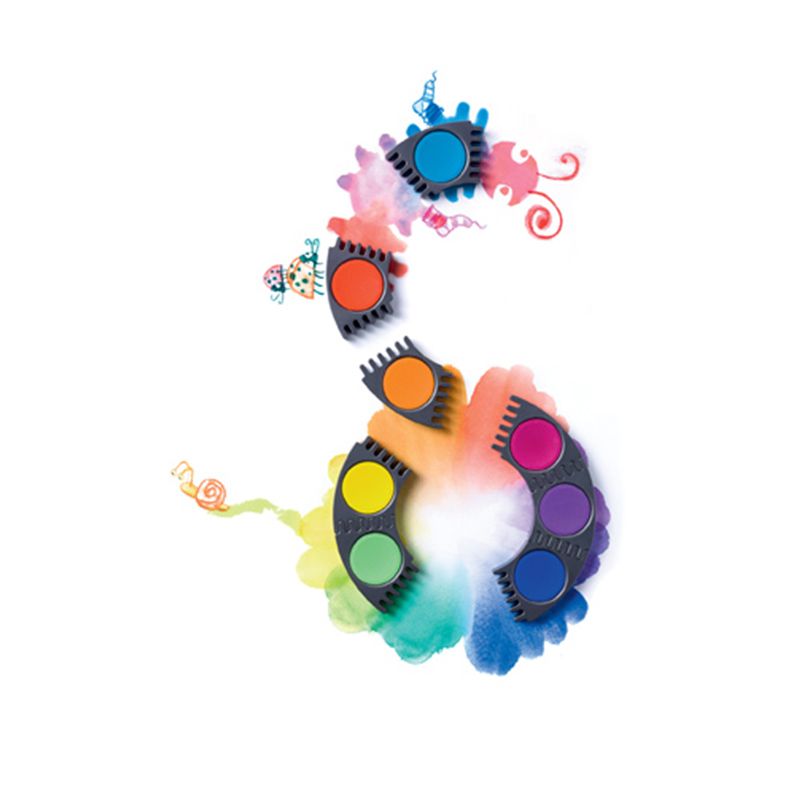 Barvy mají vysoce krycí vlastnosti, zářivé a syté barvy. Víko vodovek slouží jako plastová paleta s mnohostranným využitím: místo na jméno, integrovaná políčka pro míchaní vodových barev, díky průhlednosti děti mohou porovnávat namíchané nové odstíny s podkladovou barvou na papíře. Skvělé pro první zkušenosti s mícháním barev.
