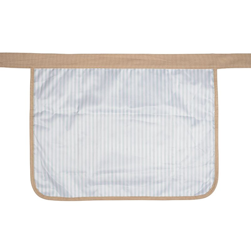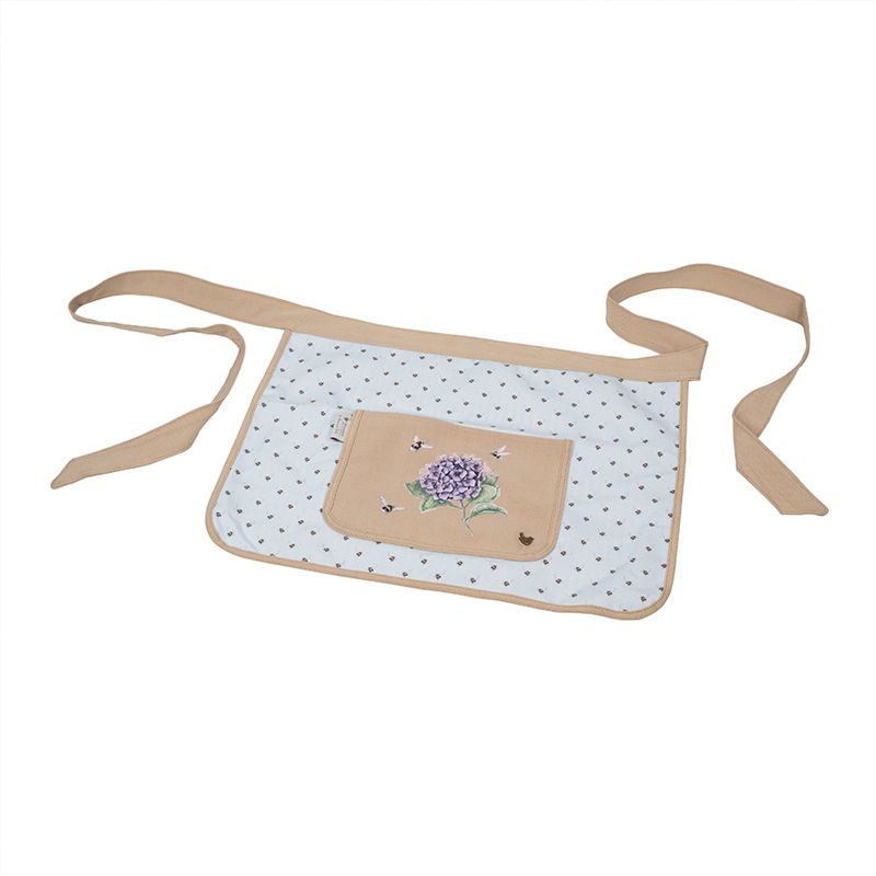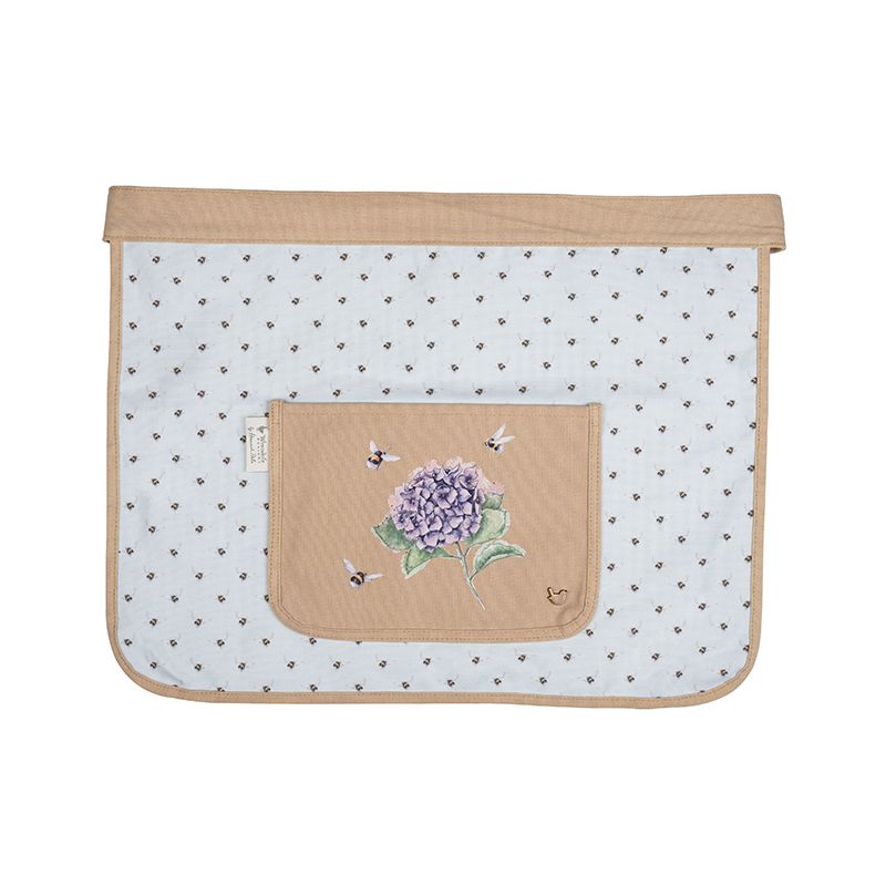 Po celé ploše je zástěra potištěna ilustracemi včeliček, lemování je ve stylově kontrastní barvě. V rohu kapsy je na ozdobu mosazný cvoček ve tvaru ptáčka – loga anglické značky Wrendale Designs. Zástěru lze prát v pračce.