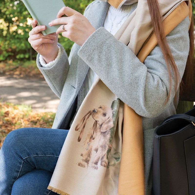 Dámská zimní šála od britské značky Wrendale Designs je skvělá k nošení kolem krku, skvěle zahřeje ramena i záda. Vyrobena je z husté, hřejivé látky a je lemovaná krátkými třásněmi. Z jedné strany je na obou koncích velká akvarelová ilustrace štěněte na bledě žutém pozadí, rubová strana je vyvedena v kontrastní okrové barvě.