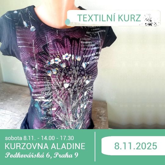 Přijďte se naučit klasické postupy v malování na černý textil! Zjistíme, jaký je rozdíl mezi bílým a černým podkladem, jaké použít barvy a proč. Vyzkoušíme metalické spreje na textil, jako podklad použijeme šablonu nebo váleček a na něj pak vytvoříme hlavní motiv. Detaily doplníme razítky a konturami.